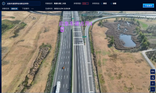 为充分发挥无人机实战实效,合肥市公安局交管支队构建起“一侧飞行、双向巡查、自动检测、数据共享、高效联动”的无人机巡查模式。无人机按照预定航线在高速公路开展巡逻,空中采集双向路况,平台自动检测交通异常事件,并预警自动生成任务工单,数据向消防、路政等多方共享,高效联动应急处置。