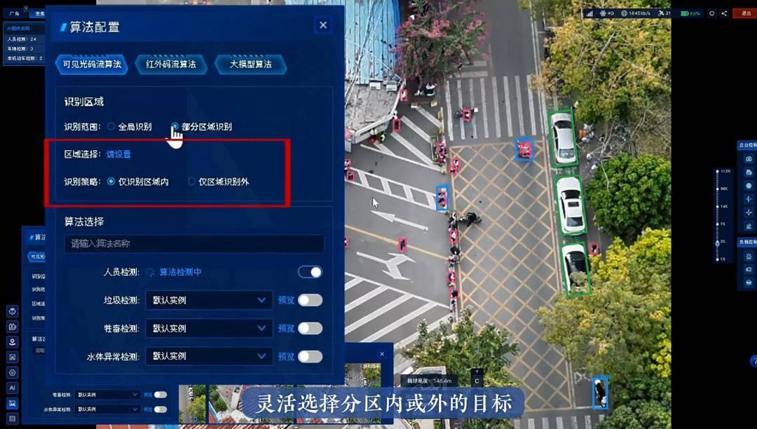 全域分区精准检测:可自由框选画面分区,灵活选择检测区域内或外的目标,算法精准聚焦重点区域,避开无效信息干扰。