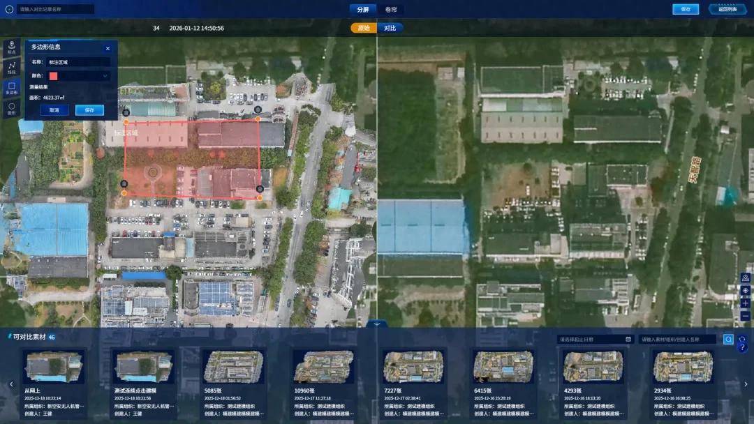 支持分别基于二维正射图、三维模型开展对比标注作业。其中,二维正射图对比标注可同步完成长宽测量,自动计算对应区域面积;三维模型对比标注支持对目标对象进行长宽高参数测量,并自动计算标注区域的面积。